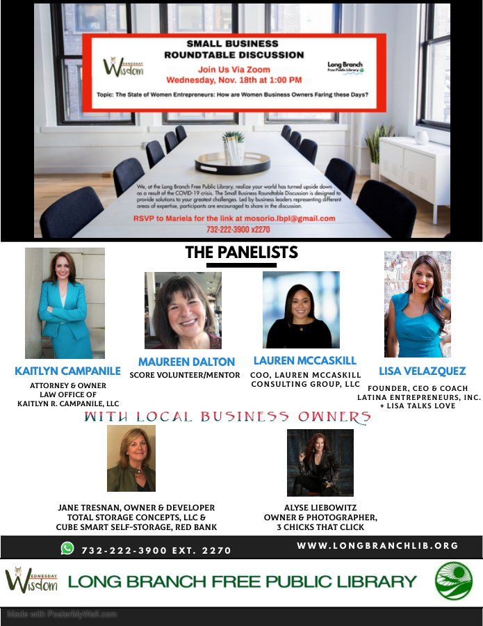 On November 18, 2020, Kaitlyn Campanile served as a panelist for the Long Branch Free Public Library's Small Business Roundtable discussion. The topic of the roundtable discussion was "The State of Women Entrepreneurs - How Are Women Business Owners Faring These Days?" Kaitlyn and other entrepreneurs shared their experiences and advice, and weighed in on recent data regarding women entrepreneurs.